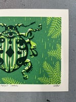 This is a three color linoleum block print measuring 5” X 7”. Two blocks were used with one in reduction to print the three layers. There is a Limited Edition of just 10 and they are printed on Stonehenge paper. Each print is safely protected with archival glassine and shipped in eco-friendly materials.